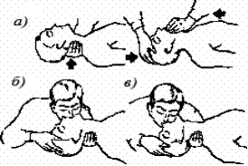 а — подготовка пострадавшего; б,в -искусственное дыхание «изо рта рот» и «изо рта в нос»