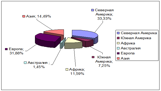 Распределение пожаров по континентам планеты в относительных показателях приведено на рис.4.1.1.