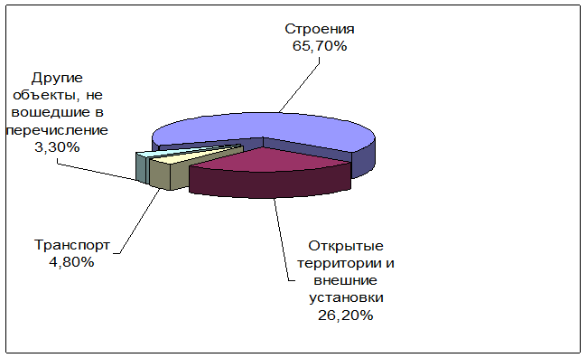 65,7% всех пожаров в Украине, а именно 40249, случилось в зданиях, 4,8% (2930) – на транспорте; 16050 пожаров и возгораний, или 26,2%, приходится на места открытого хранения материалов, открытые территории, внешние установки и тому подобное, 2052 (3,3%) – на другие объекты, не вошедшие в перечень (рис. 5.2.).