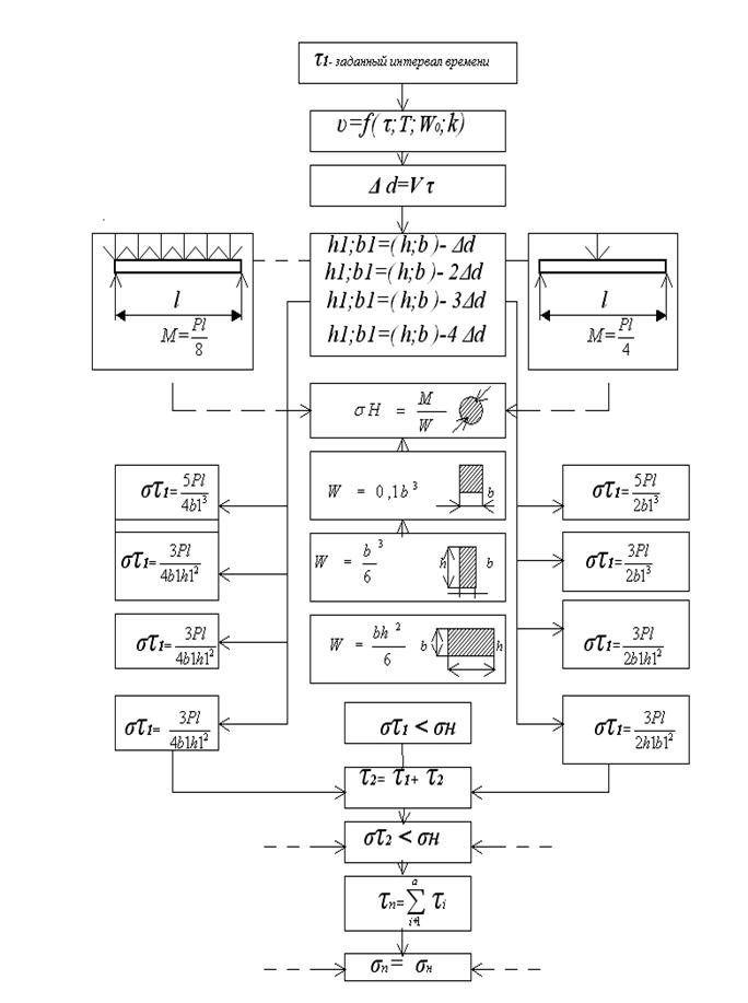 С учетом формы сечения конструкции, условий опирания, схемы размещения распределенной или сосредоточенной нагрузки выбираются формулы для оценки напряжения δτ1. В формулы рис. 3.4. подставляются новые параметры сечения h1, b1, которые приняла конструкция после работы в условиях пожара за время г1. Полученное напряжение сравнивается с нормативным δн.На этом и заканчивается первый цикл вычисления.