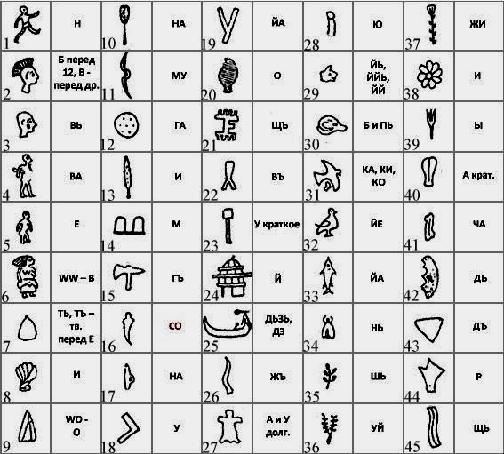 Рис. 2. Фонетические значения иероглифов ФД (на основе репертуара знаков ФД в книге Г. Йенсена «Письмо», 1935 [32]).