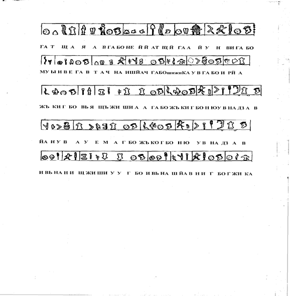 Пробовал читать Фестский диск и Дмитриенко А.: ЦЕ ГОСЬ РО Й БАЗЯ НЫШЕ ШЕ ОТЪ ЦЕ ГОСЬ Н НОПО РО Й ОТЪ ОТЪМЕСУ НОВУ ВЫ ЖИ ЩЕ ВЫ ЙУВО ЩЕ ОТЪ М СЫ ОТЪ М СЫ ОТЪ Р ЖЬ ВЫ ПОСЬ ЛЕ ШЕ М СЕ ОТЪ ПОРЫ БА ЗЯ НЫ ШЕ ШЕ ОТЪ М СЕ ОТЪ Р ЖЬ ВЫПОСЬЛЕШЕ ТЯСИ ЦПОЙУОТЪ КИЙЕ ГИ РО НЫНОГИ[26].