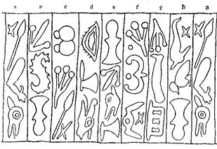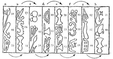 К их числу принадлежит иероглифическая надпись на печати из собрания Эшмолеанского музея. Данную печать приобрел на Крите А. Эванс, издана она была в 1949 г. Печать имеет форму вытянутой призмы из полудрагоценного камня сардоникса с восемью боковыми гранями (длиной 19 мм, толщиной 9 мм, ширина каждой грани — 3 мм). Эта многогранная печать с продольно просверленным сквозным отверстием предназначалась для полного прокатывания её вокруг своей оси по сырой глине или другому мягкому материалу. В результате прокатывания печати по материалу получался оттиск восьмистрочного текста (рис. 22), содержащего в общей сложности 31 иероглиф. Знакам древних письменностей принято присваивать условные номера. Это дает возможность упростить работу с текстами, прибегая к их цифровой передаче. Принятая в настоящее время нумерация знаков иероглифики Крита установлена А. Эвансом. Пример подобной нумерации представлен на рис 23.