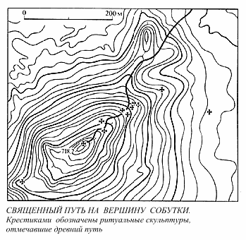 1. Пеpвичным местом могла быть плоская пpодолговатая веpшинка 70 X 250 м, вытянyтая с запада на восток и с кpyглой площадкой в восточной части, где мог, напpимеp, стоять идол.