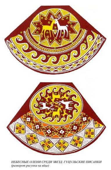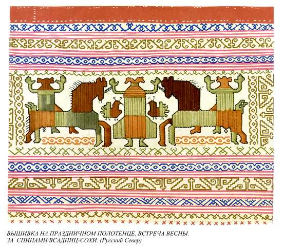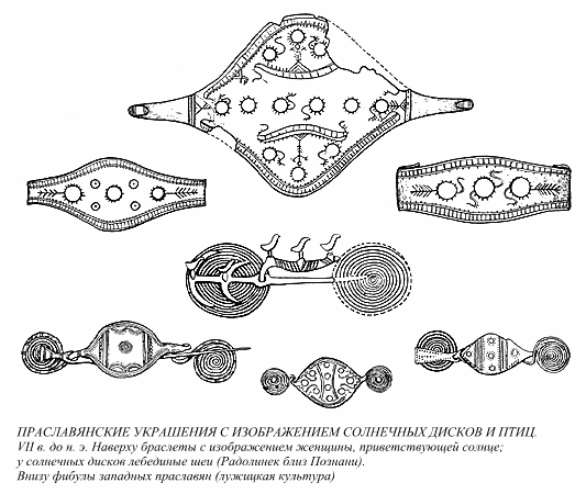 В славянской деревянной резьбе верховенство Рода подчеркнуто помещением его символа на высоких местах: на щипце кровли, над стенами, а внутри домов - на потолочной матице-сволоке.(См., например: Slovenske 1'udove umenie. Bratislava, 1953, tab. 21.) Иногда на деревянных "полотенцах", спускающихся от верха кровли, помещалась, как на прялках, сложная композиция из нескольких солнц, как бы бегущих по небосводу, а центральное место занимало "колесо Юпитера", символизирующее белый свет.