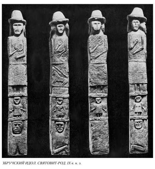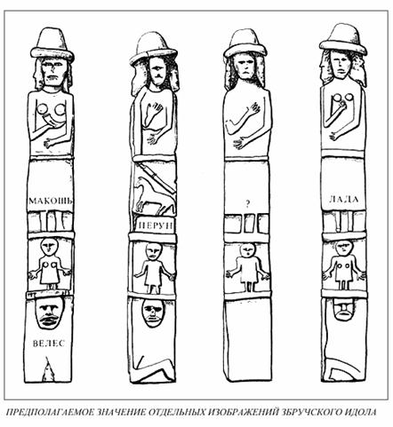 Рожаниц много; они и в двух храмах, и на стенах храмов, и на двух краях композиции. Макошь одна.(Всего в композиции 12 изображений рожаниц, но это нисколько не противоречит установленной выше парности этих богинь. Здесь пара больших рожаниц вне построек, пара рожаниц-"орлов" внутри двух храмов и по паре каждого вида мелких рожаниц на стенах храмов.) Это соответствует и всем упоминаниям одной Макоши и рожаниц в письменных источниках, и включению Макоши в киевский пантеон 980 г., и наличию Макоши с рогом изобилия на главной грани Збручского Святовита-Рода.