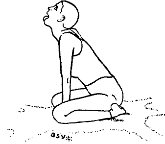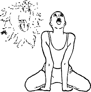 1. Сидя в сукхасане (простой позе). Симха крийя, выполняемая в этом положении, наиболее проста и подходит для тех, кому трудно сидеть в ваджрасане. Этот вариант не столь эффективен, как основная техника, и от него следует отказаться, как только вы научитесь сидеть в ваджрасане, не испытывая неудобства.