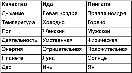 Ида нади и пингала нади — это проводящие пути двух разных аспектов праны. Они представляют два противоположных полюса одной и той же энергии. Ида считается отрицательным и также называется чандра (лунный) нади. С другой стороны, пингала является положительным и его часто называют сурья (солнечный) нади. С этими двумя нади ассоциируются различные атрибуты или качества. Некоторые из них приведены ниже: