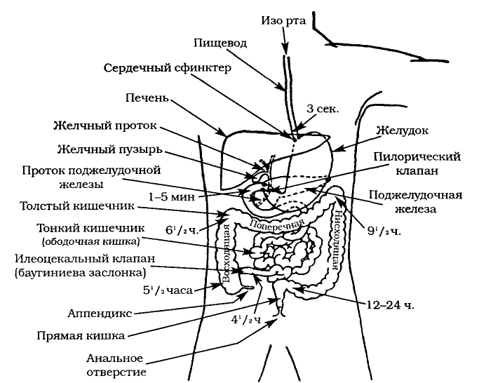 Цифры показывают время, необходимое для того, чтобы первые частицы съеденной пищи достигли данной точки