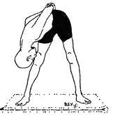 Оставайтесь в конечном положении примерно одну секунду. Затем разверните туловище в противоположную сторону, дотрагиваясь правой рукой до левой ступни. Сделайте несколько таких поворотов туловища. Потом повернитесь лицом вперёд и вернитесь в исходное положение.
