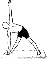 Разверните туловище вправо и коснитесь левой рукой правой ступни.