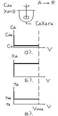 Проточный реактор смешения представляет собой аппарат, в котором интенсивно перемешиваются реагенты, например, при помощи мешалки. В него непрерывно подаются реагенты и непрерывно выводятся продукты реакции. Поступающие в аппарат этого типа частицы вещества мгновенно смешиваются с находящимися в нем частицами, то есть равномерно распределяются в объеме аппарата. В итоге во всех точках реакционного объема мгновенно выравниваются параметры, характеризующие процесс. На рис 2 показаны зависимости концентрации (а), степени превращения (б), скорости реакции (в).