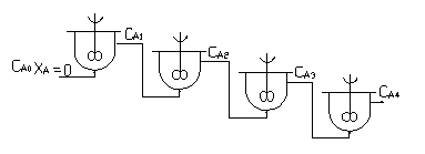 В отдельно взятом реакторе полного смешения вследствие того, что концентрации реактивов мгновенно снижаются до конечной величины, скорость реакции при больших степенях превращения невелика и поэтому для достижения высоких степеней превращения требуются реакторы большого объема. При этом более целесообразным является установка ряда последовательно установленных реакторов – каскада реакторов (см. рис 3 и рис.4).