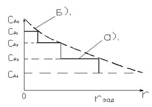 Рис. 4. Изменение концентрации исходного вещества по ступеням каскада реакторов полного смешения а), в реакторе идеального вытеснения б)