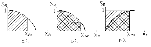 Если селективность с увеличением степени превращения уменьшается (а, б), выход также будет уменьшаться. В этом случае площадь под кривой будет больше площади прямоугольника, и следовательно предпочтителен реактор идеального вытеснения или периодический реактор. Каскад реакторов полного смешения (б) дает более высокий выход продукта, чем единичный.