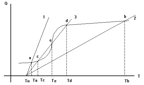 Линиями 1, 2, 3 показаны линейные зависимости скорости отвода теплоты потоком реакционной смеси. Точки a, b, c, d, e соответствуют состоянию, когда соблюдается тепловой баланс. В этих точках процесс стационарен и зависит от величин, входящих в уравнение адиабаты.