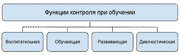 4. Диагностическая: показ результатов обучения и воспитания школьников, уровня сформированности умений и навыков; выявление уровня соответствия знаний учащихся образовательному стандарту; установление пробелов в обучении, характера ошибок, объема необходимой коррекции процесса обучения; определение наиболее рациональных методов обучения и направлений дальнейшего совершенствования учебного процесса; отражение результатов труда учителя, выявление недочетов в его работе, что способствует совершенствованию педагогического мастерства учителя.