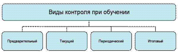В школе применяются следующие виды контроля: предварительный, текущий, периодический и итоговый. Методы контроля: устный опрос, письменный опрос, контрольная работа,проверка домашнего задания,тестовый контроль,рейтинговый контроль