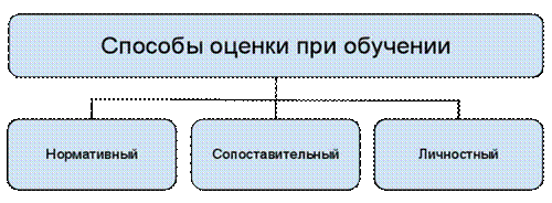 Исходя из требований современной гуманистической педагогики, учителю в текущей работе нужно использовать личностный способ оценивания. Такой способ позволяет контролировать продвижение каждого ученика в его развитии. Нормативный способ оценивания необходим для ориентирования учащихся в своих достижениях и показа эталонных образцов учебной работы.