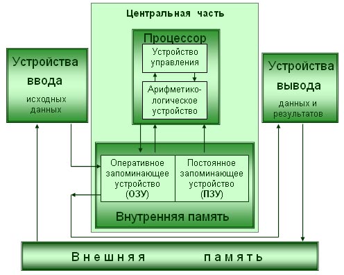 Фон Нейман не только выдвинул основополагающие принципы логического устройства ЭВМ, но и предложил ее структуру, представленную на рисунке.