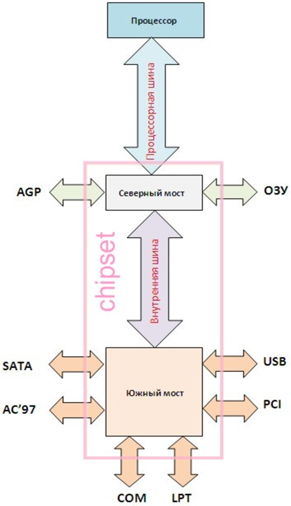Практически у всех современных чипсетов, набор системной логики состоит двух микросхем северного и южного мостов. Название микросхем обусловлено их положением относительно шины PСI: северный - выше, южный - ниже.