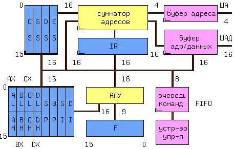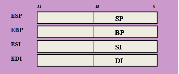 - регистры SI (индекс источника), DI (индекс приемника) предназначены для хранения адресов индекса источника и приемника данных при операциях над строками и им подобных.