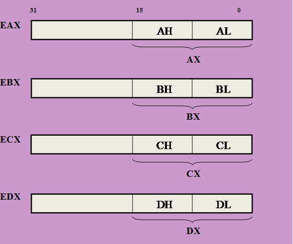 - регистр AX – регистр-аккумулятор, через его порты осуществляется ввод-вывод данных в микропроцессор, а при выполнении операций умножения и деления AX используется для хранения первого числа, участвующего в операции (произведения, частного) после ее завершения; Если мы заносим в регистр ЕАХ значение 0x12345678, то регистр АХ будет содержать значение 0x5678 (0x56 в АН и 0x78 в AL), а значение 0x1234 будет помещено в верхнюю часть 32-разрядного регистра ЕАХ (буква Е означает Extended – расширенный, т.е AL, AH/AX/EAX - 8,8/16/32).