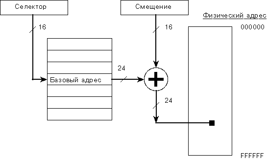 В первом приближении можно считать, что для процессора i80286 селектор является индексом в таблице, содержащей базовые 24-разрядные физические адреса сегментов. В процессе преобразования логического адреса в физический процессор прибавляет к базовому 24-разрядному адресу 16-разрядное смещение, т.е. вторую компоненту логического адреса.