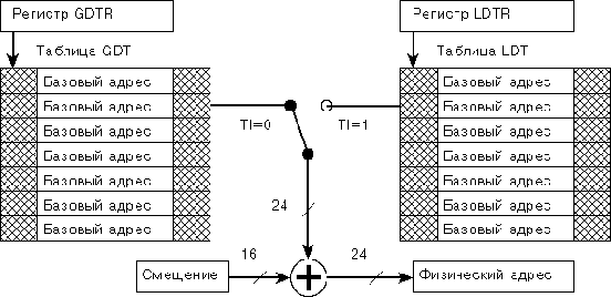 На рис. 23 показана уточнённая схема преобразования адресов в защищённом режиме. Из рисунка видно, что регистры процессора GDTR и LDTR определяют расположение в памяти таблиц GDT и LDT соответственно. Таблицы GDT и LDT содержат дескрипторы, описывающие сегменты памяти. В этих дескрипторах, помимо другой информации (заштрихованная область) содержится 24-разрядный базовый адрес сегмента.