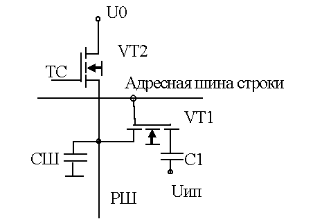 В основе запоминающего элемента лежит один конденсатор С1 и один МОП- транзистор VT1. На схеме конденсатор показан в виде отдельного элемента, хотя реально его функции выполняет емкость затвор-подложка. Транзистор VT2 открывается сигналом ТС=1 и от источника U0 емкость СШ заряжается до напряжения U0.