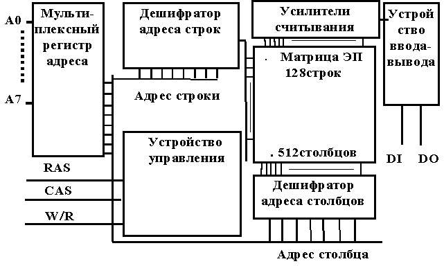 Для формирования внутренних сигналов, управляющих включением и выключением в определенной последовательности различных узлов микросхемы, в структуре микросхемы предусмотрена схема управления. Входные, выходные и управляющие сигналы микросхемы памяти: RAS (Row Adress Strobe) - строб адреса строки; CAS (Column Adress Strobe) - строб адреса столбца; WR (записьчтение); вход данных - DI; выход данных - DO. Микросхема имеет усилители считывания и регенерации в каждом столбце матрицы, регистр адреса, дешифраторы адреса строк и адреса столбцов, устройство управления и устройство ввода и вывода данных. Структура микросхемы приведена на рис.2.