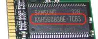 Микросхемы памяти могут иметь и другую организацию. Например, распространенные (2006г.) микросхемы (чипы) синхронной динамической памяти DDR SDRAM фирмы Samsung: K 4 H 5 6 0 8 3 8 E — T C B 3 (рис.3) имеют емкость 36 мегабайт (256 мегабит). Адресуемая ячейка памяти чипа 8 битная.