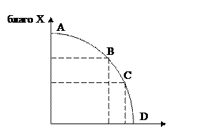 Учет альтернативных затрат можно представить с помощью кривой производственных возможностей – простейший двухсекторной экономической модели, показывающей и возможный и необходимый объем выпуска благ при полном использовании ограниченных ресурсов. При этом имеется множество альтернативных вариантов производственных комбинаций ресурсов и соответствующей структуры выпускаемой продукции. Вместе с тем, при данных запасах производственных ресурсов и данном уровне развития технологии их переработки в благо можно увеличить производство одного альтернативного блага только за счет снижения производства другого (рис.1.1.).
