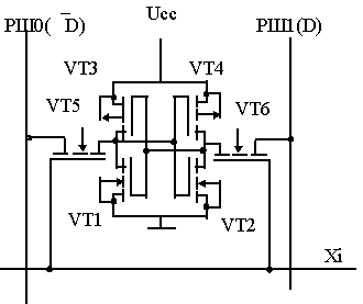 Элемент статической памяти, вариант схемотехнической реализации которого по КМДП технологии приведен на pис.2, составляет статический триггер на МДП- транзисторах. Для построения триггера используются транзисторы VT1 - VT2 с каналами n - типа, VT3 - VT4 с каналами p - типа и ключи на транзисторах VT5, VT6, через которые триггер подключается к информационным шинам PШ0 и PШ1. Состояние ключей зависит от уровня сигнала дешифратора на шине строки Xi. При Xi = “1” - ключи открыты и информация с шин PШ0 и PШ1 записывается в триггер или передается из него на выход. Прием и передача информации производится парафазным кодом. Если состояние РШ1=D, то состояние РШ2 = D, при “0” на шине строки Xi - ключи закрыты, и триггер находится в режиме хранения. Для хранения информации в триггере необходим источник питания. При обращении к ИС для записи “0” или “1” следует подать соответствующие уровни на входы DIO, а затем подать код адреса, разрешающий сигнал CS и сигнал WR, соответствующий режиму записи. при подаче указанных сигналов возбуждается строка, выбранная дешифратором кода адреса строк, и открывается доступ по информационным (разрядным) шинам ко всем ЭП данной строки, одновременно возбуждается один из выходов дешифратора кода адреса столбцов, который коммутирует соответствующие столбцы читаемого слова на устройство ввода.