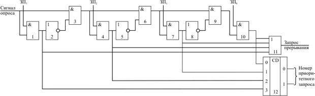 Данная схема используется для анализа запросов аппаратных прерываний. Приоритет запросов прерываний (ЗПi) уменьшается с уменьшением номера запроса. В тот момент, когда компьютер должен определить наличие и приоритет внешнего аппаратного прерывания (обычно после окончания выполнения каждой команды), процессор выдает сигнал опроса. Если на входе ЗП3 присутствует сигнал высокого уровня (есть запрос), то на элементе 11 формируется общий сигнал наличия запроса прерывания и дальнейшее прохождение сигнала опроса блокируется. Если ЗП3=0, то анализируется сигнал ЗП2 и так далее. На шифраторе (элемент 12) формируется номер поступившего запроса прерывания.