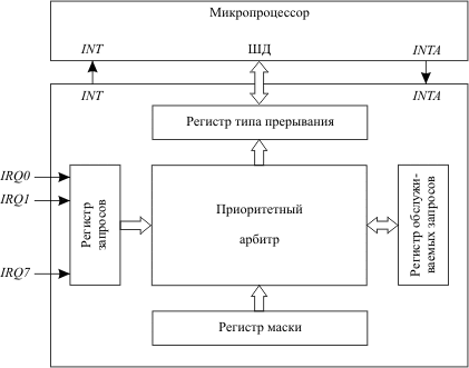 - сравнение приоритета выделенного запроса с приоритетом запроса, который в данный момент может обрабатываться в микропроцессоре, формирование сигнала запроса на вход INT микропроцессора в случае, если приоритет нового запроса выше;
