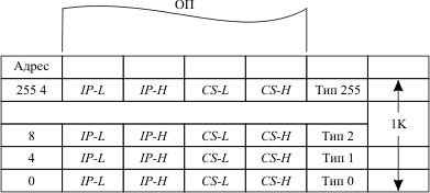 Переход к соответствующему обработчику прерывания осуществляется (в реальном режиме работы микропроцессора) посредством таблицы векторов прерываний. Эта таблица (рис. 14.5) располагается в самых младших адресах оперативной памяти, имеет объем 1 Кбайт и содержит значения сегментного регистра команд (CS) и указателя команд (IP) для 256 обработчиков прерываний.