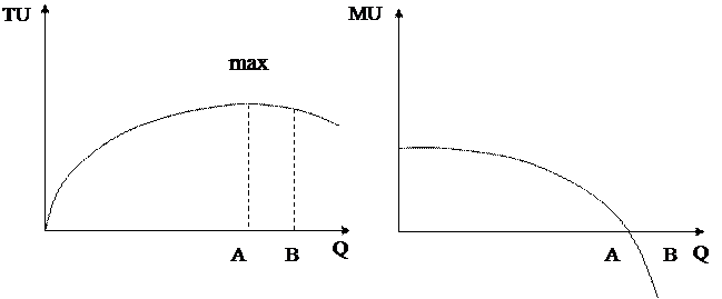 На рис. 2.1 видно, что по мере увеличения потребления блага Q общая полезность TU возрастает, хотя предельная полезность MU уменьшается. Максимум удовлетворения общей полезности достигается в точке А, когда предельная полезность равна 0. Это означает, что благо полностью удовлетворяет потребность. Если дальнейшее потребление блага приносит вред (предельная полезность отрицательная), общая полезность снижается.