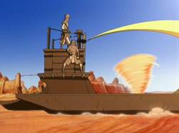 | Земляная волна | Маг создаёт на земле подобие волны на воде. Она может двигаться во все стороны сразу или быть однонаправленной. Иногда, маг встаёт на гребень такой волны. Аанг дважды, в сериях «Состояние Аватара» и «Царь Земли», создавал земляные волны прыгая с высоты, что придавало им дополнительную энергию и разрушающую мощь. | |