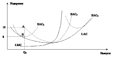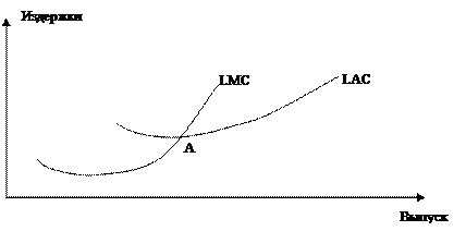 При положительном или отрицательном эффекте масштаба линия долгосрочных средних издержек не является больше горизонтальной. Она представлена в виде кривой LAC, которая имеет U -образную форму и является огибающей по отношению к кривым краткосрочных средних издержек для предприятий разных размеров. Кривая LAC никогда не поднимается выше любой кривой краткосрочных средних издержек. Точки минимальных средних издержек самого маленького и крупнейшего из предприятий не находятся на кривой долгосрочных средних издержек вследствие положительного и отрицательного эффекта масштаба на долговременном этапе. Например, небольшое предприятие, действующее с минимальными издержками, нерентабельно, потому что у более крупного предприятия есть возможность выпускать продукцию с более низкими издержками.