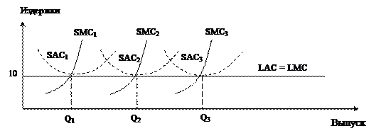 Рис. 4.9 - График долгосрочных и краткосрочных издержек производства при постоянном эффекте масштаба