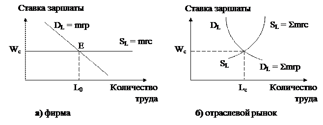 Ставка заработной платы, установившаяся на отраслевом рынке труда выступает для отдельной конкурентной фирмы как заданная величина, с которой она вынуждена соглашаться. Так как каждая отдельная фирма нанимает незначительное количество из общей численности рабочих, она не влияет на ставку заработной платы. Поэтому для отдельной фирмы предложение труда абсолютно эластично и предельные издержки фирмы на труд равны зарплате (MRPL = W).