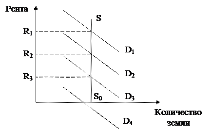 До сих пор мы исходили из предположения об одинаковом качестве земли. На самом деле различные участки земли значительно отличаются по производительности, что дает землевладельцам различный уровень рентного дохода. Производительность земли различна, так как различно ее плодородие и климатические условия, а также различно местоположение участков. Участки, расположенные более выгодно по отношению к другим сопряженным ресурсам и к непосредственному потребителю, дают более высокие доходы. Различия в ренте, обусловленные качественной неоднородностью земли, можно проследить на рисунке 7.8, но немного с другой точки зрения. Предположим, что производится только один сельскохозяйственный продукт на четырех участках земли разного качества, причем размер каждого участка фиксирован и равен OS. Предельная производительность каждого участка земли отражена кривыми спроса D1, D2, D3, D4. Участок земли №1 – наиболее производителен, участок земли №4 – наименее производителен. Соответствующая экономическая рента с участков 1, 2, 3 будет R1 > R2 > R3, что отражает качественную неоднородность трех участков земли. Качество участка №4 настолько низкое, что его невыгодно вводить в оборот полностью.