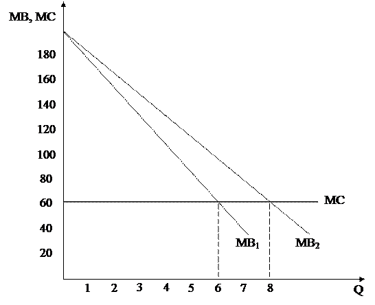 Если выгода и издержки распределяются равномерно, то будет посажено 7 деревьев (МС = MB = 60).