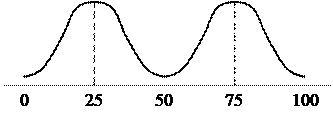 Рассмотрим борьбу трех кандидатов. Например, один занимает позицию В, а два других позицию М. Тогда первый получит голоса избирателей, чьи позиции расположены правее линии b, а два других поделят голоса избирателей, чьи позиции расположены левее линии b. Поэтому большинство получит первый кандидат. Если один из двух кандидатов принял бы позицию А, то кандидат, занимающий позицию М, получил бы незначительный процент голосов избирателей, который равен площади под кривой распределения между линиями a и b. Поэтому у кандидата с позицией М есть стимул выйти из сегмента АВ, что поставит другого кандидата в затруднительное положение. Процесс продвижения может продолжаться долго, но он имеет свои границы. В обществе может встречаться бимодальное распределение голосов (рис. 9.3) или полимодальное распределение (рис. 9.4). Представленные модели абстрактны, но они позволяют объяснить факторы, движущие поведением кандидатов.