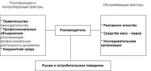 6. Законодательство (правительственные и профессиональные учреждения) и конкуренция (конкуренты, конкурентная среда) являются регулирующим и контролирующим фактором: нормативные акты, инструкции и положения регламентируют поведение сторон в процессе рекламной деятельности, конкуренты служат внешним ограничителем продвижения на рынке.
