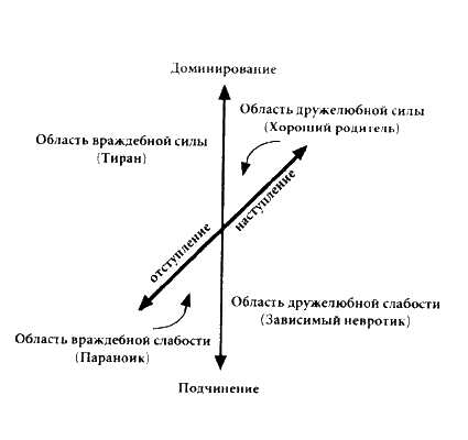 | Сетка первого и второго контуров образует четыре квадранта. Заметьте, что Враждебная Сила (тиран) склонна к параноидальной замкнутости; он должен править, но он также боится. Вспомните Гитлера, Сталина, Говарда Хьюза и др., а также недоступный Замок и Суд в аллегориях Кафки. Заметьте также, что зависимый невротик находится совсем не в области отступления; он наступает на вас, требуя удовлетворения его эмоциональных “нужд” (импринтов). |