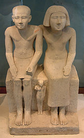 Египетское общество было высоко стратифицированным, где социальный статус явно отображался.[58][59] Мужчины управляли домом с участием женщин и выбирали наследников по желанию. Старейшины проводили консультации и почитались после смерти[60]. Браки были моногамными (хотя встречались случаи двоеженства и многоженства среди фараонов) и не утверждались религией. Существовала и свадебная церемония или запись об этом. По-видимому, чтобы этот союз приняли, было достаточно сказать, что пара желает жить вместе. Мужчины женились в возрасте шестнадцати - восемнадцати лет, а женщины в возрасте двенадцати - четырнадцати. Существовали также браки между фараоном и одной из его дочерей[61]. Мужчины с более высоким экономическим статусом, возможно, наряду с законной женой (nebet-per - "хозяйка дома") имели и наложницу, которая рассматривалась как признак богатства. Тем не менее, женщин, имевших более одного мужчины наказывали.[62]