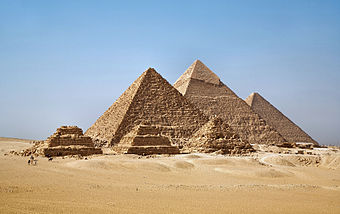 Египетские пирамиды — величайшие архитектурные памятники Древнего Египта, среди которых одно из «семи чудес света» — пирамида Хеопса. Пирамиды представляют собой огромные каменные сооружения пирамидальной формы. Некоторые из них использовались в качестве гробниц для фараонов Древнего Египта. Слово «пирамида» — греческое. По мнению одних исследователей, большая куча пшеницы и стала прообразом пирамиды. По мнению других учёных, это слово произошло от названия поминального пирога пирамидальной формы. Всего в Египте было обнаружено 118 пирамид. По общепризнанной версии, первая египетская пирамида была построена по приказу фараона 3 династии Джосера — Ступенчатая пирамида в Саккара, архитектором которой, согласно древнеегипетской традиции, считается высший сановник (чати) Джосера Имхотеп. По мнению египтологов эта пирамида является развитием мастабы — традиционной гробницы знати в Древнем Египте периодов Раннего и Древнего царств. Самыми известными пирамидами являются Великие пирамиды на плато Гиза (пирамиды Хеопса, Хефрена и Микерина)[138].