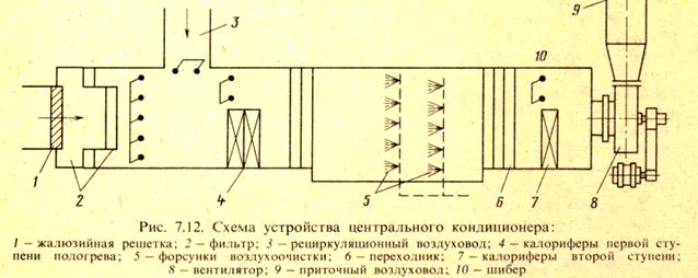 Кондиционеры могут работать по приточной схеме, т. е. только на наружном воздухе, когда не допускается рециркуляция воздуха по санитарно-гигиеническим условиям, и на наружном воздухе с частичным использованием рециркуляции. Принципиальная схема центрального кондиционера показана на рис. 7.12.